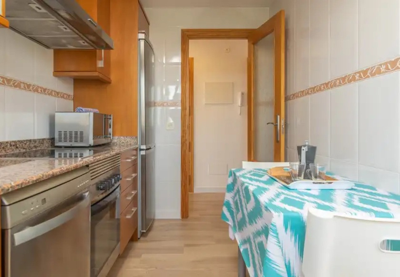 El apartamento dispone de dos dormitorios dobles, equipados con aire acondicionado para garantizar el máximo confort durante todo el año. Está situado en segunda planta y cuenta con un agradable balcón. También dispone de un baño completo con bañera y ducha, y una acogedora sala de estar con televisión, ideal para descansar después de un día de playa.