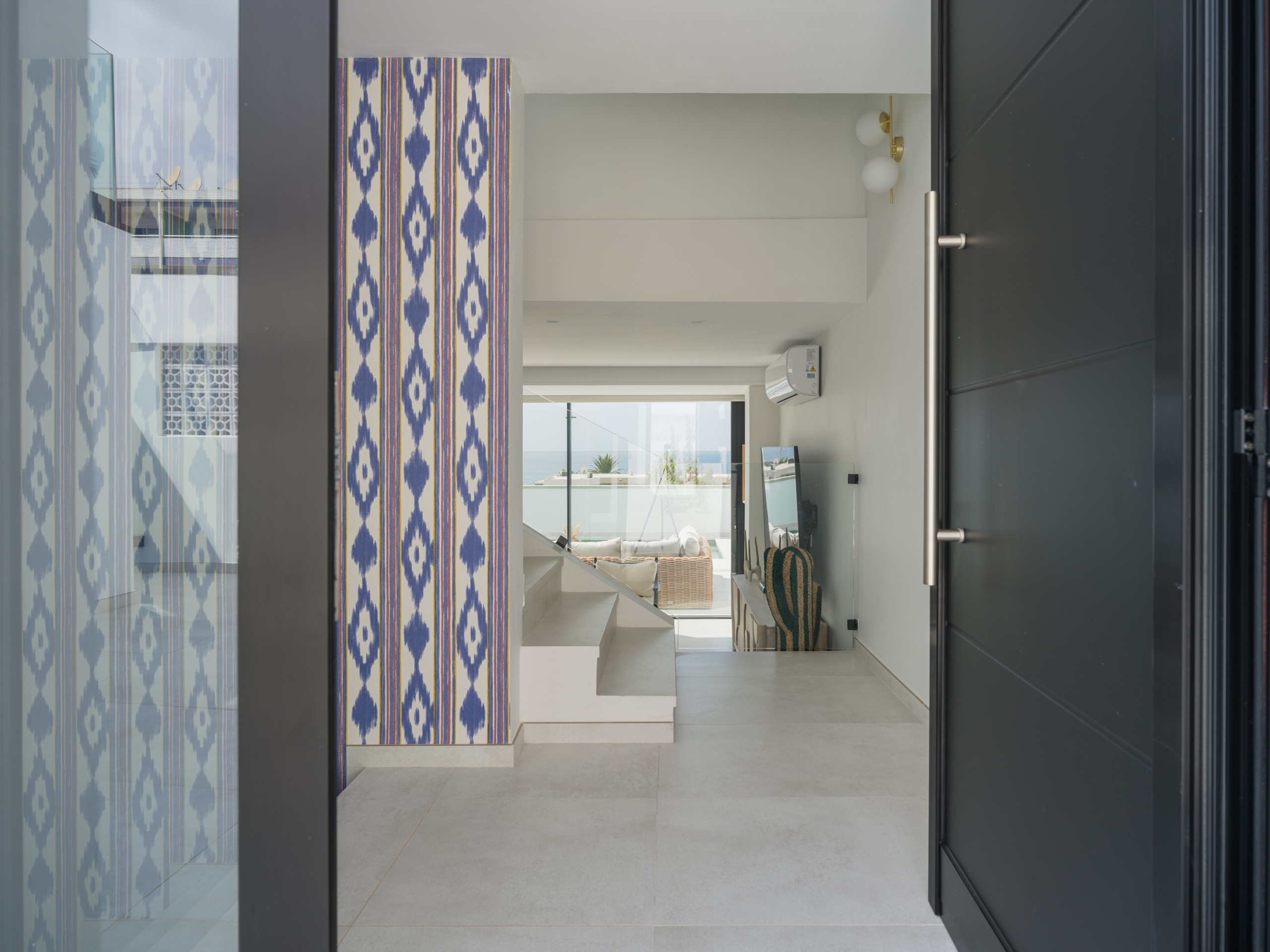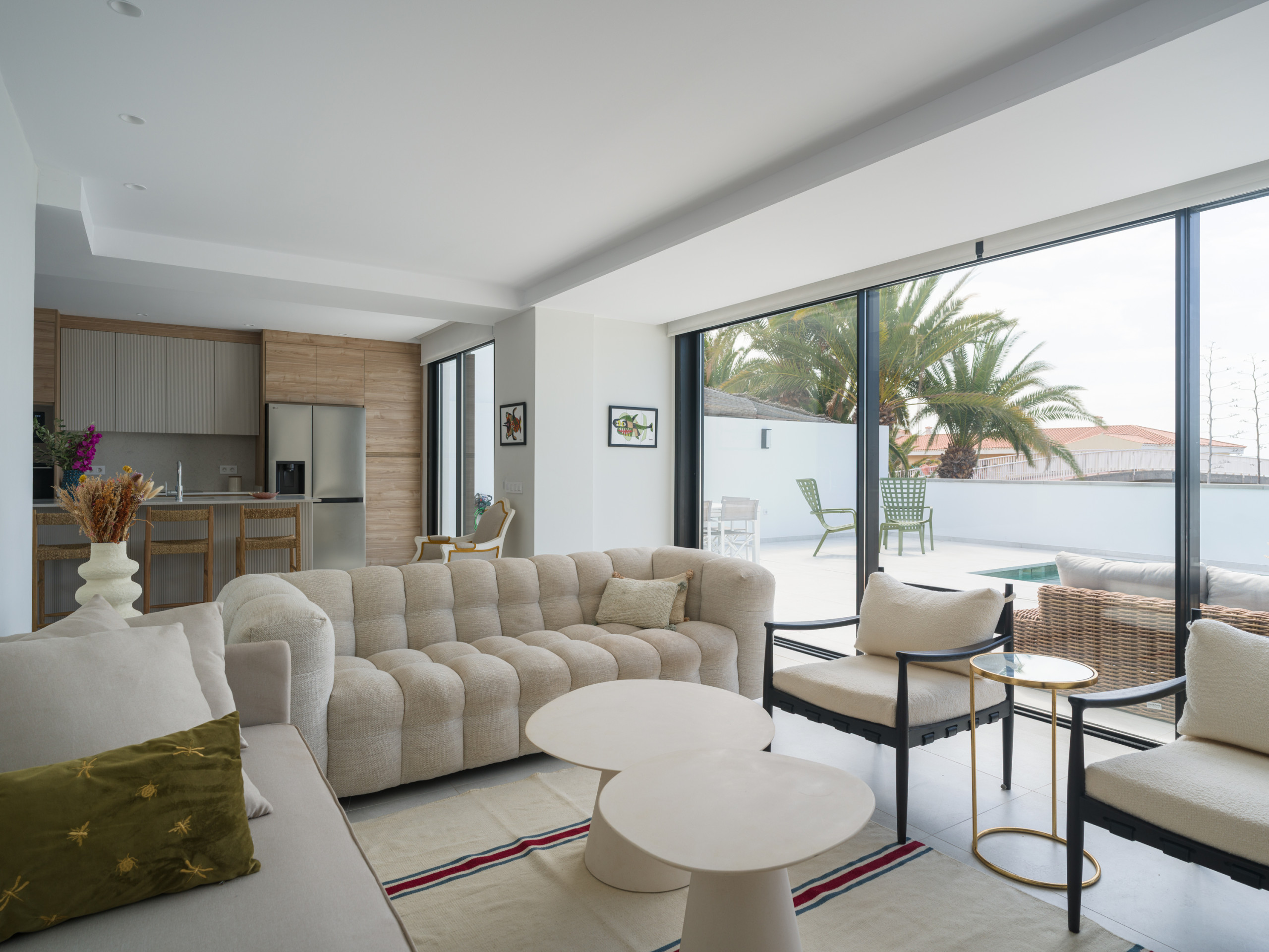 Salón-cocina integrado, con acceso directo a la terraza mediante grandes puertas correderas que permiten disfrutar de las vistas al mar 🌊. El salón incluye Smart TV de 65" con canales internacionales.