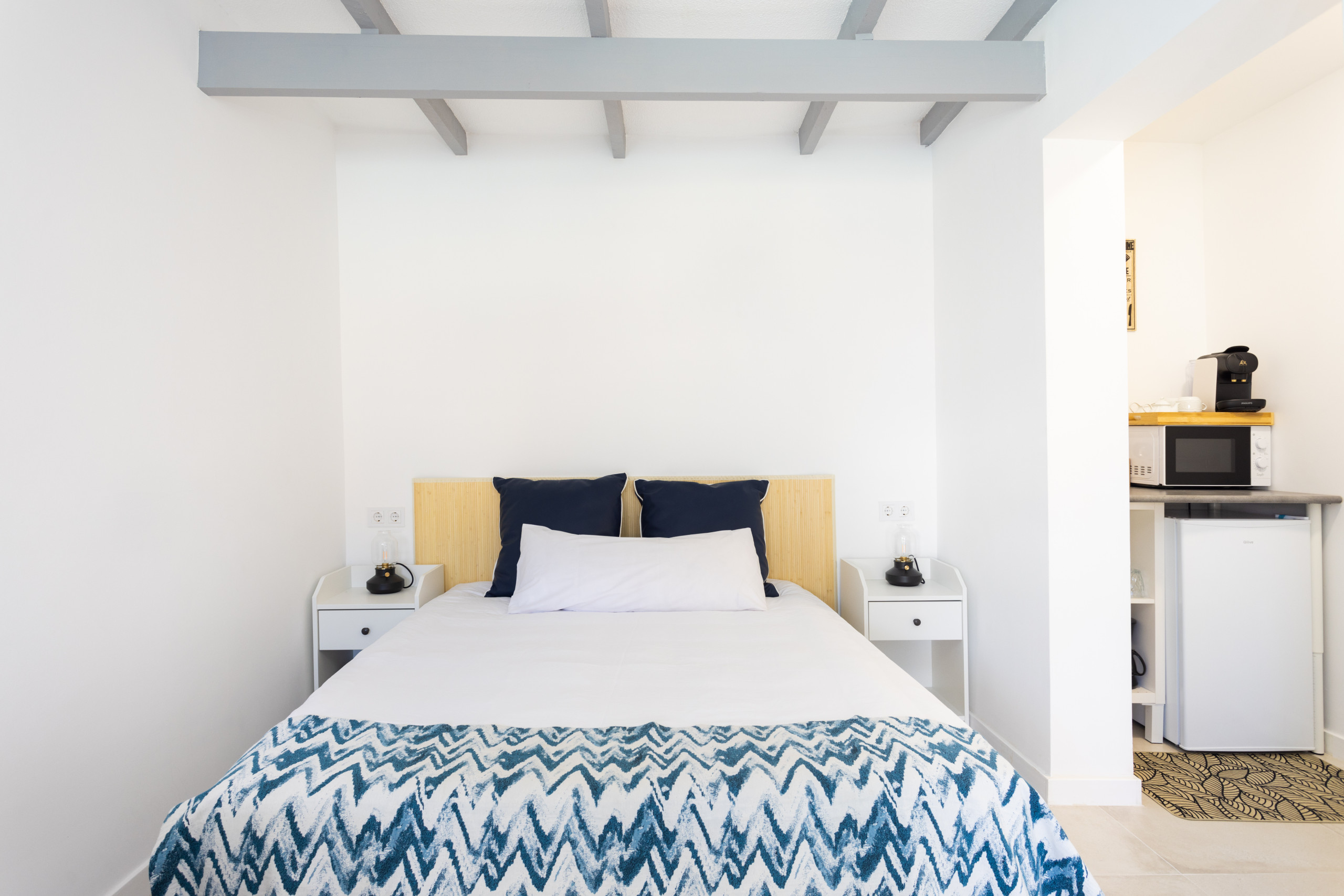 Zona kitchenette (sin cocción) equipada con nevera, cafetera, tostadora y hervidor