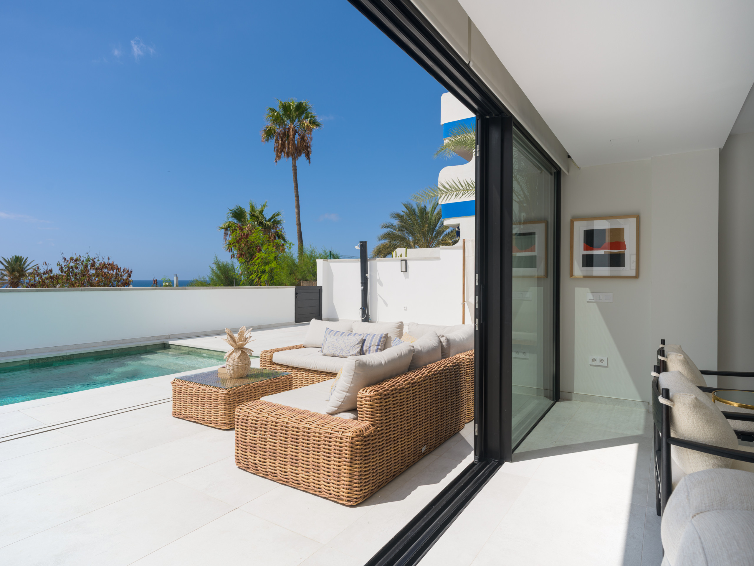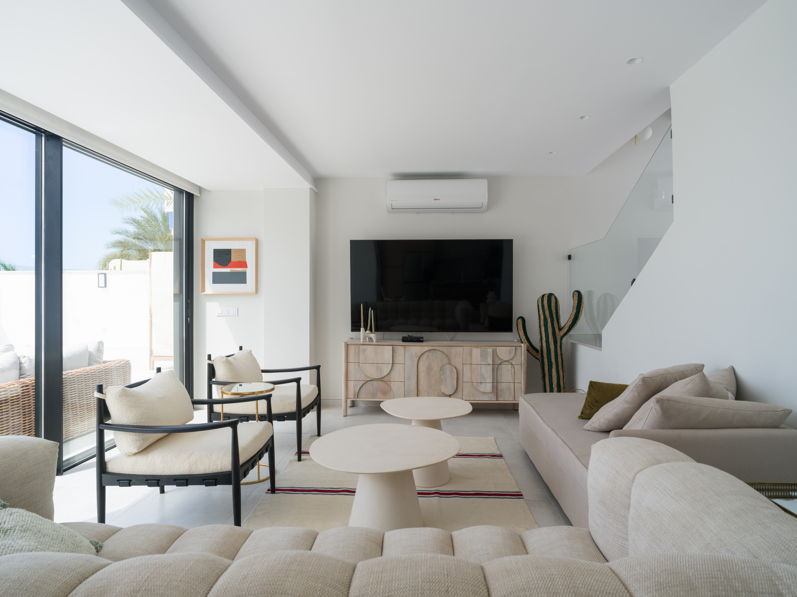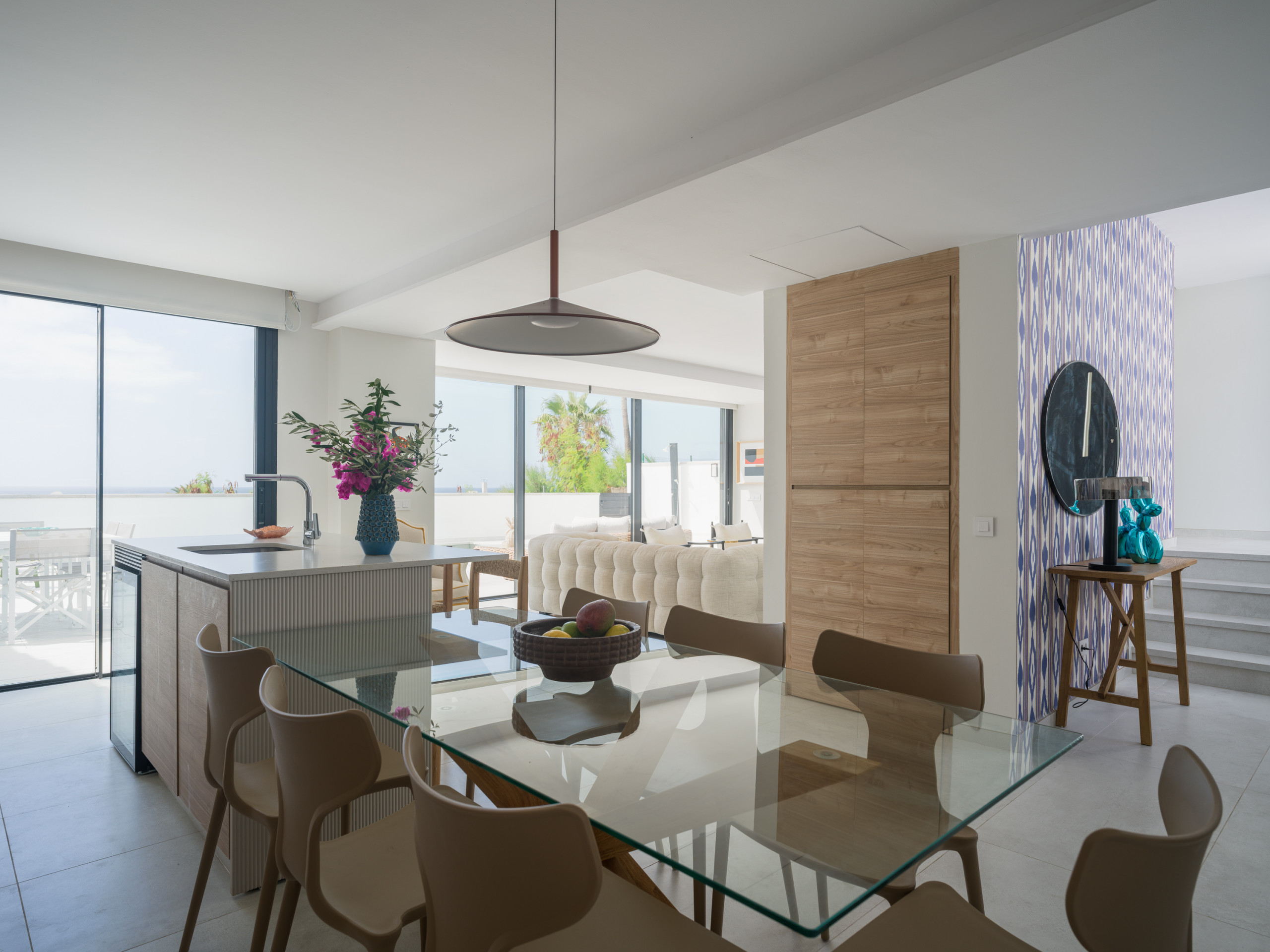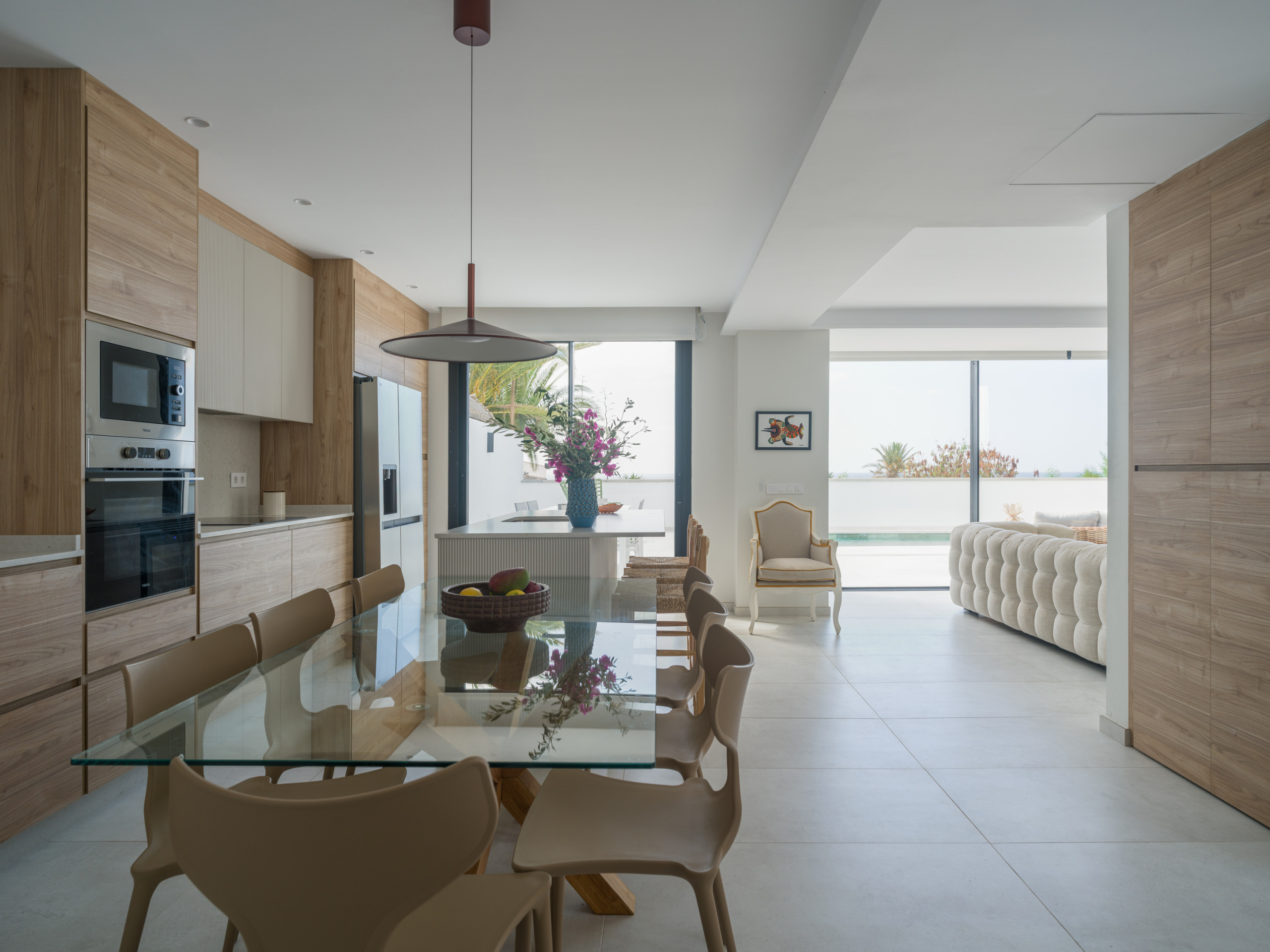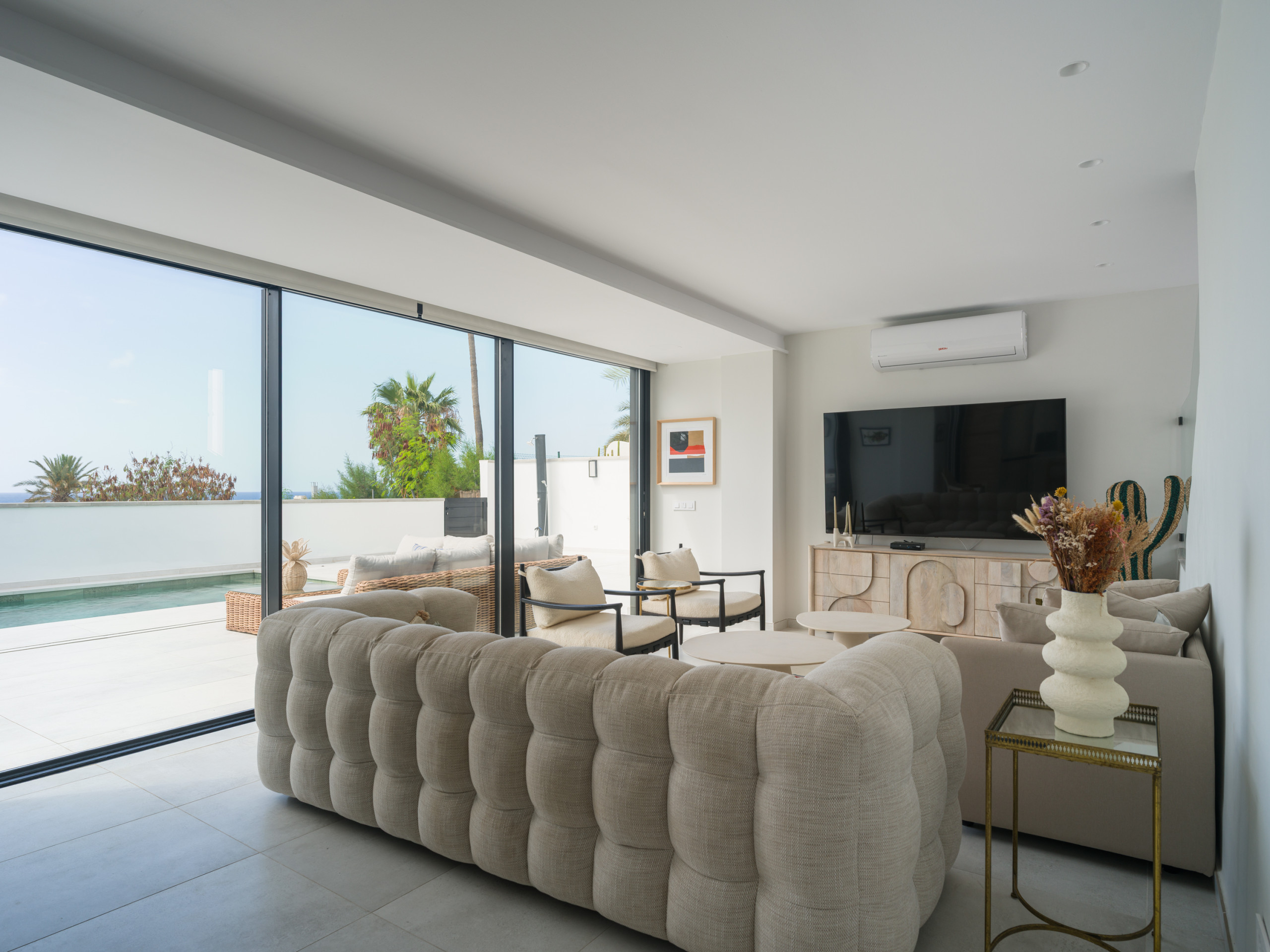 🛋️ Offenes Wohn- und Esszimmer mit großen Schiebetüren, die direkten Zugang zur Terrasse bieten – mit wunderschönem Meerblick 🌊. Das Wohnzimmer ist mit einem 65" Smart-TV mit internationalen Kanälen ausgestattet.