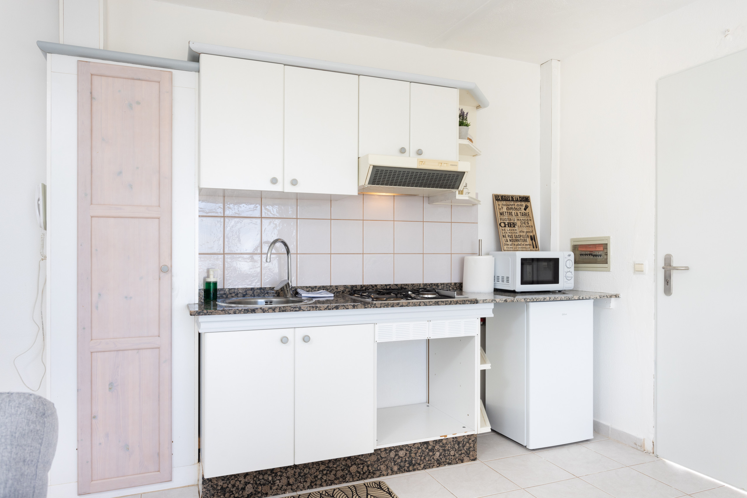 Voll ausgestattete Küche mit Kühlschrank, Mikrowelle, Kaffeemaschine, Toaster und Wasserkocher