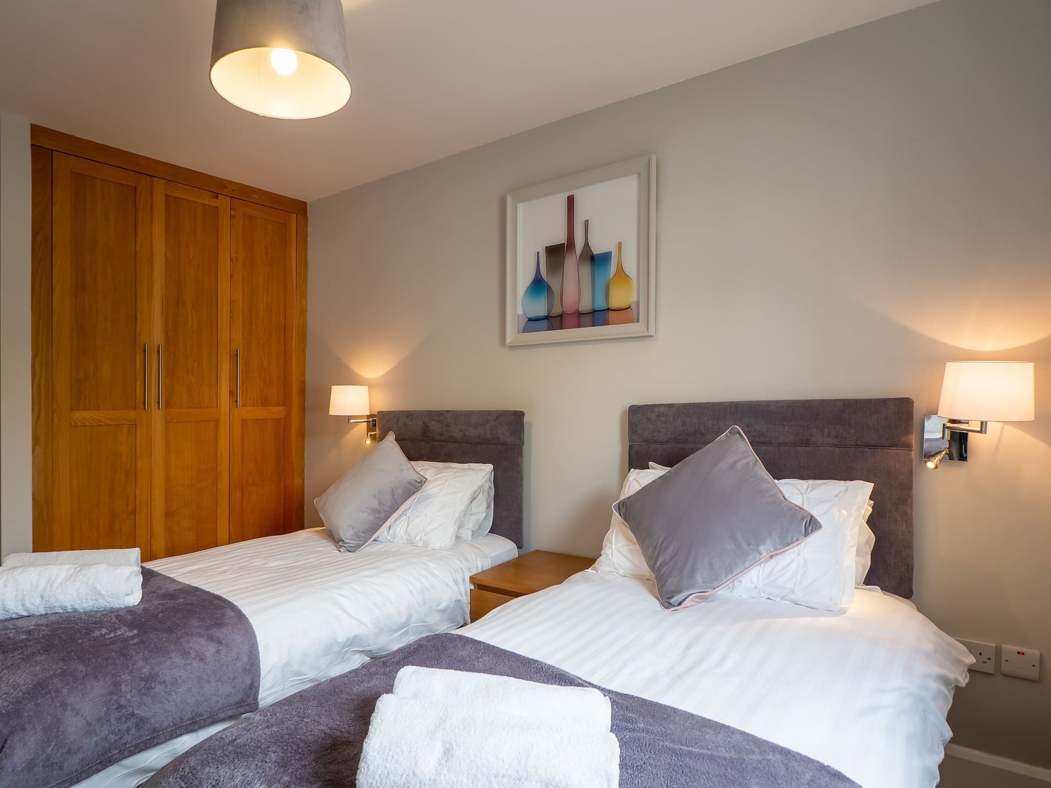 Bedroom Two: Two single beds with wooden flooring and built-in wardrobes. Overlooking Clifden church.