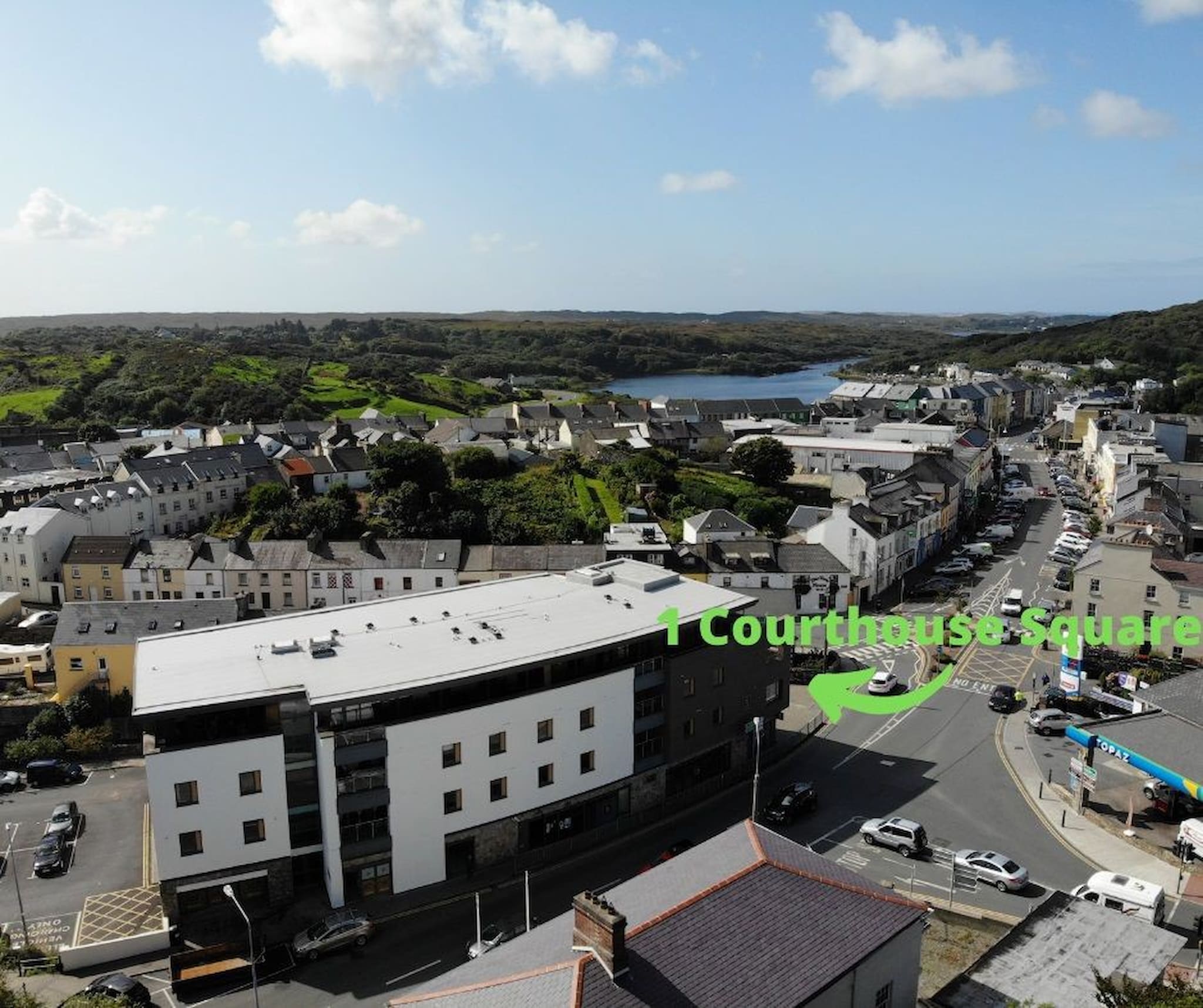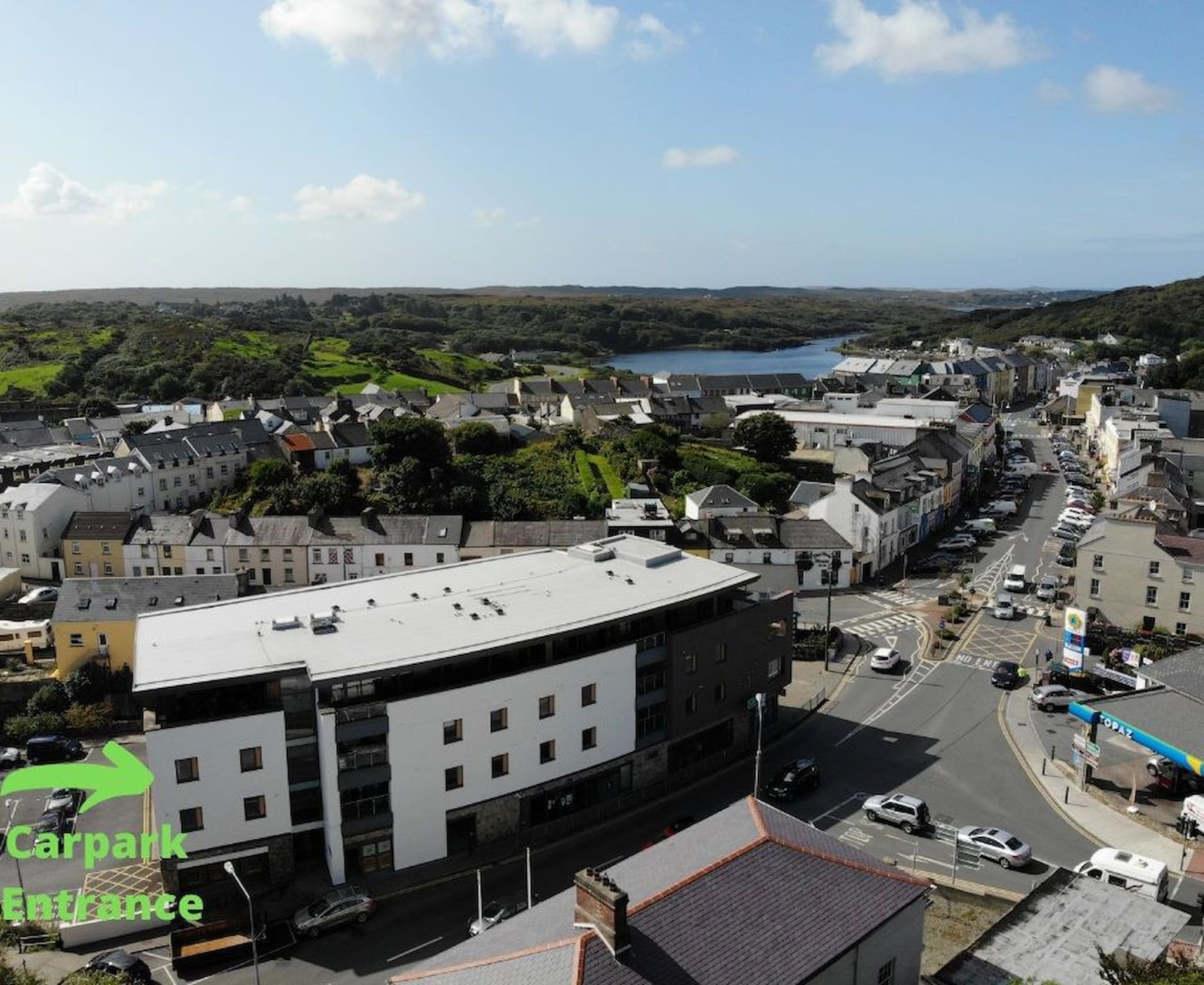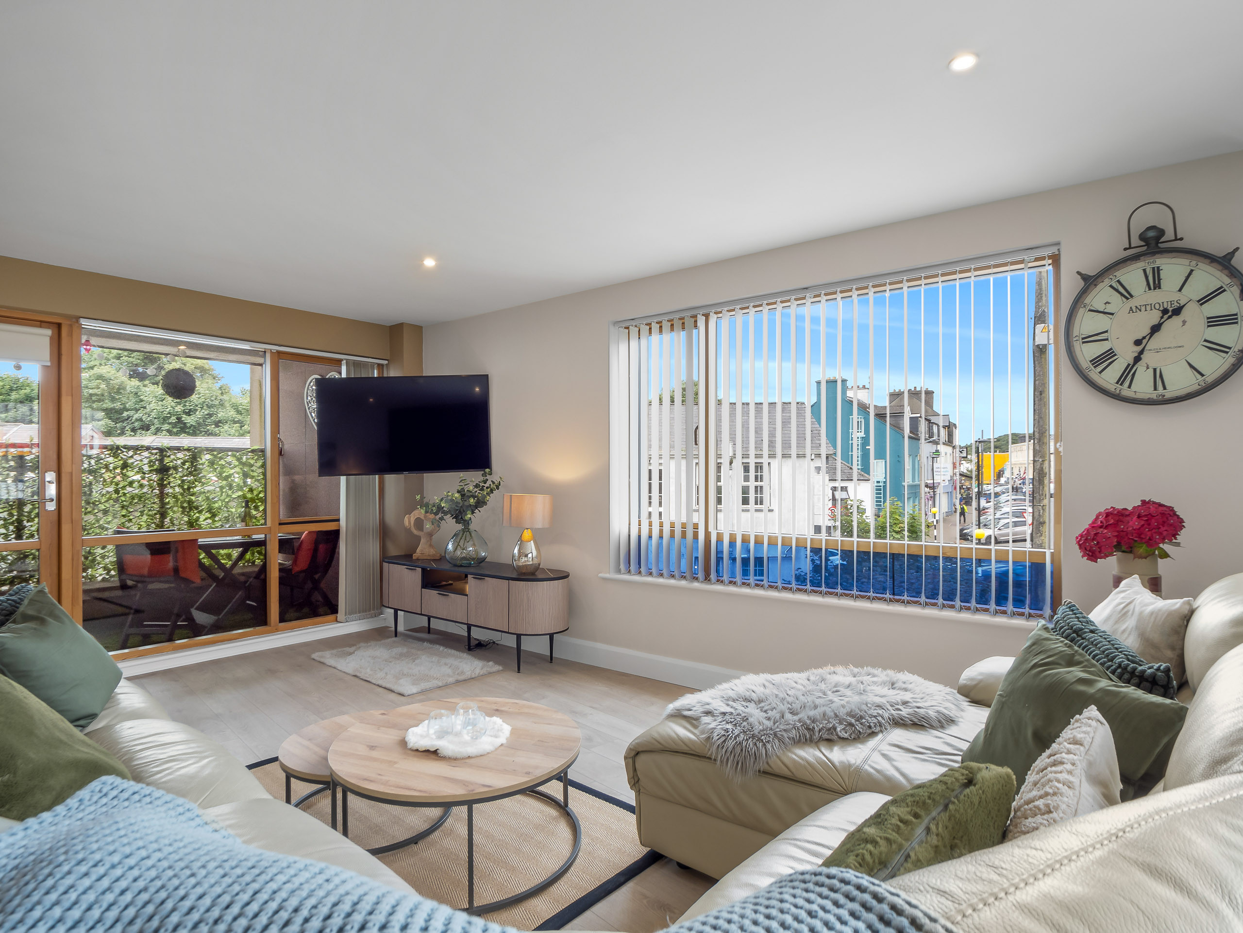Once you enter this large open-plan sitting room/kitchen dining area you are immediately struck by the large windows with a birds' eye view of Clifden Town Centre. The apartment benefits from a very spacious and airy reception room with bright yet warm tones and modern features. Newly fitted open-plan kitchen comes equipped with an electric oven, electric hob, fridge freezer, washing machine and microwave. Nespresso coffee machine, kettle & toaster. There is a small balcony with a table & 2 chairs to enjoy your morning coffee.