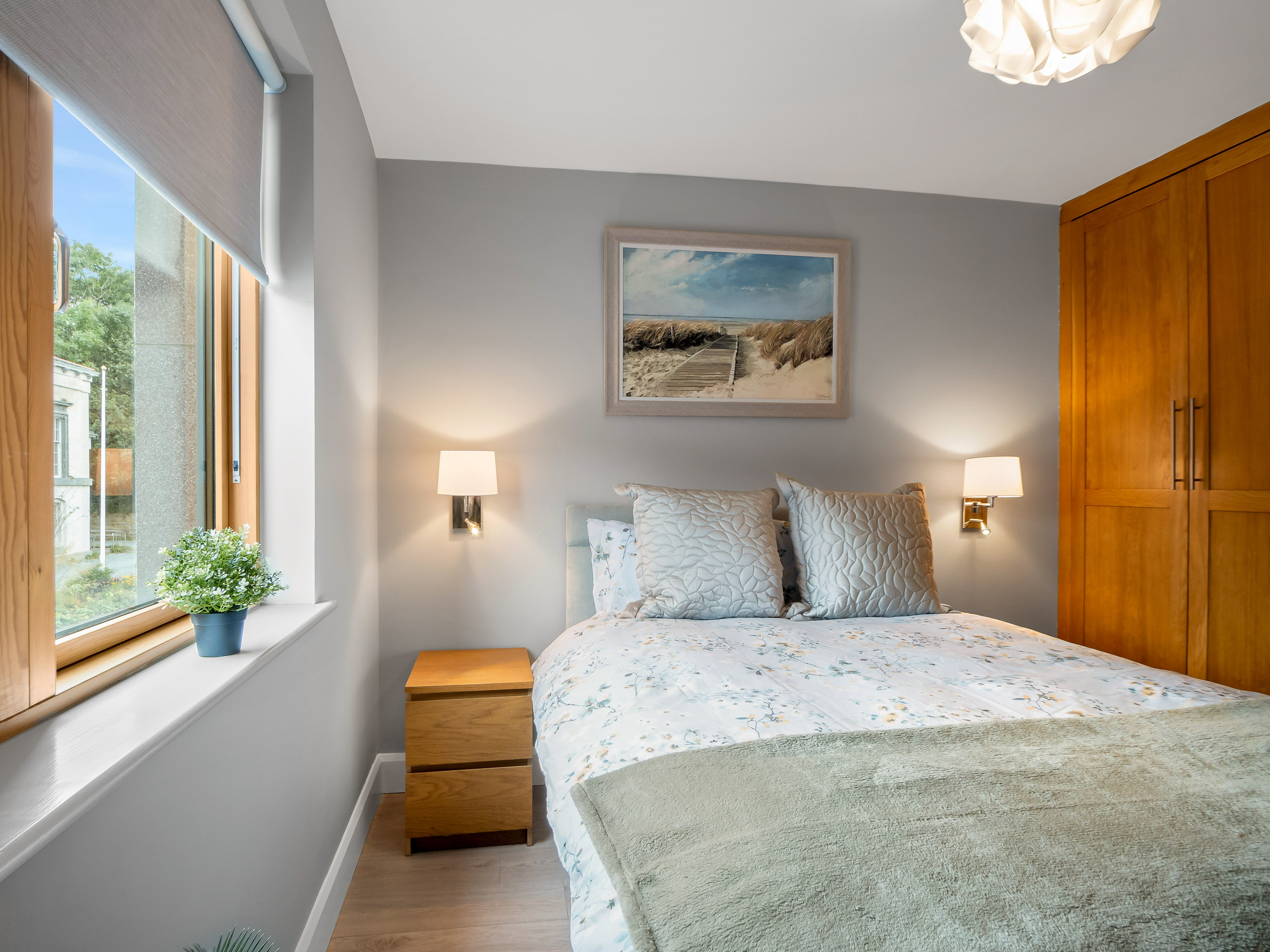 Main Bedroom: Queen-sized bed with wooden flooring and built-in wardrobe. Window overlooking Clifden church.