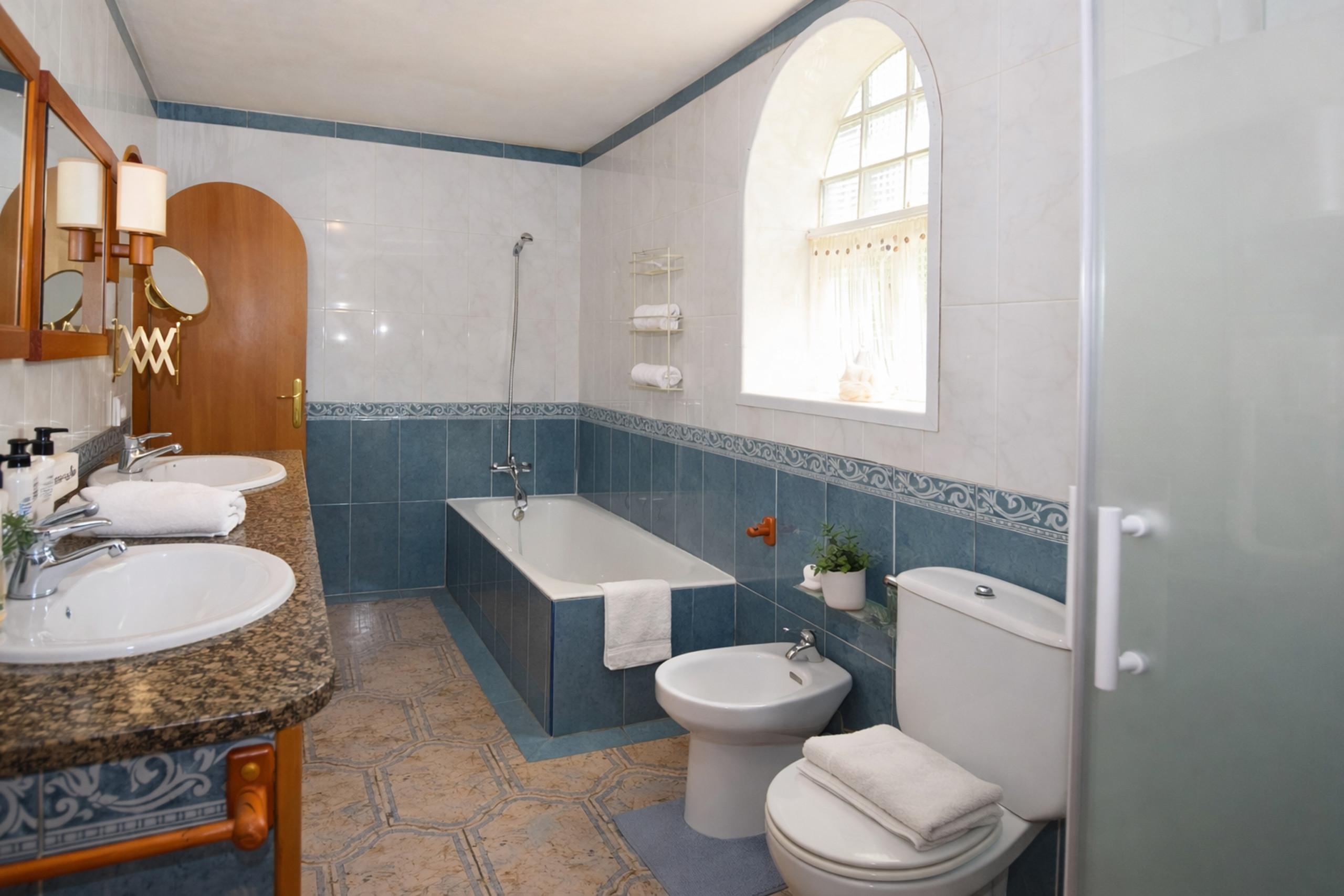 Five bedrooms: 2 with double bed, three more with 2 single beds and three bathrooms: two with bathtub and one with shower, complete the rest areas.