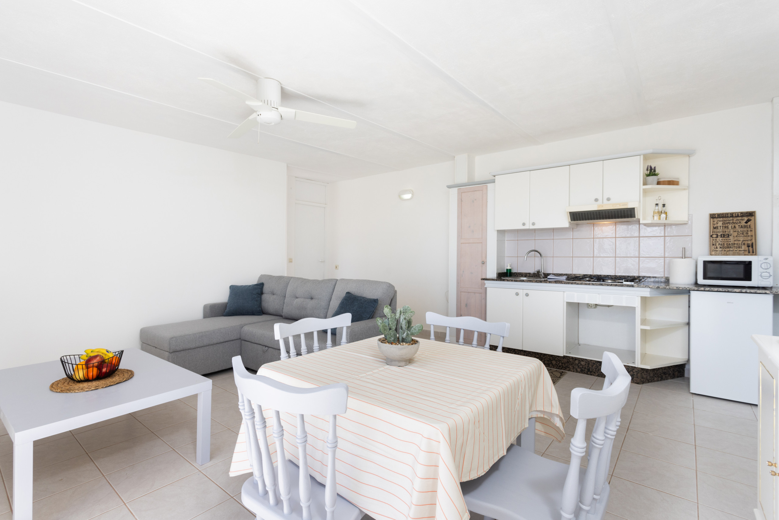 Cuisine entièrement équipée avec réfrigérateur, micro-ondes, cafetière, grille-pain et bouilloire