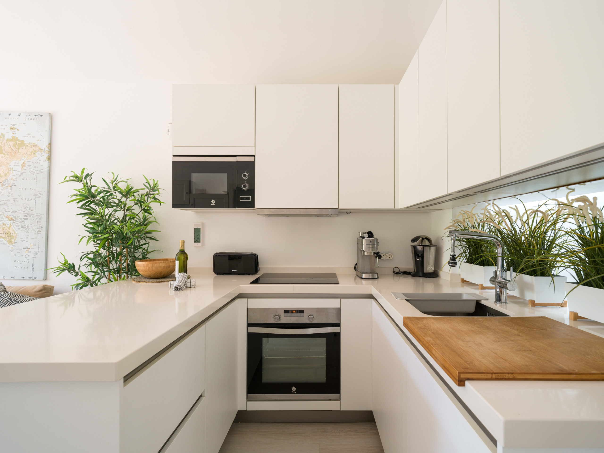 La cuisine américaine, à vitrocéramique, est équipée avec réfrigérateur, micro-ondes, four, congélateur, lave-vaisselle, vaisselle/couverts, ustensiles/cuisine, cafetière et bouilloire.