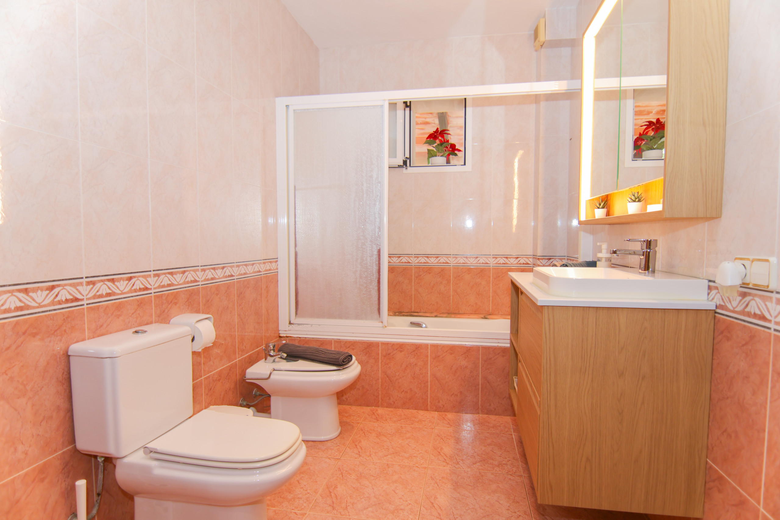 La cuisine, de style semi-ouvert avec un bar américain, est bien équipée. Il y a trois chambres (1 avec un lit double, 2 avec deux lits individuels) et deux salles de bains avec baignoire.